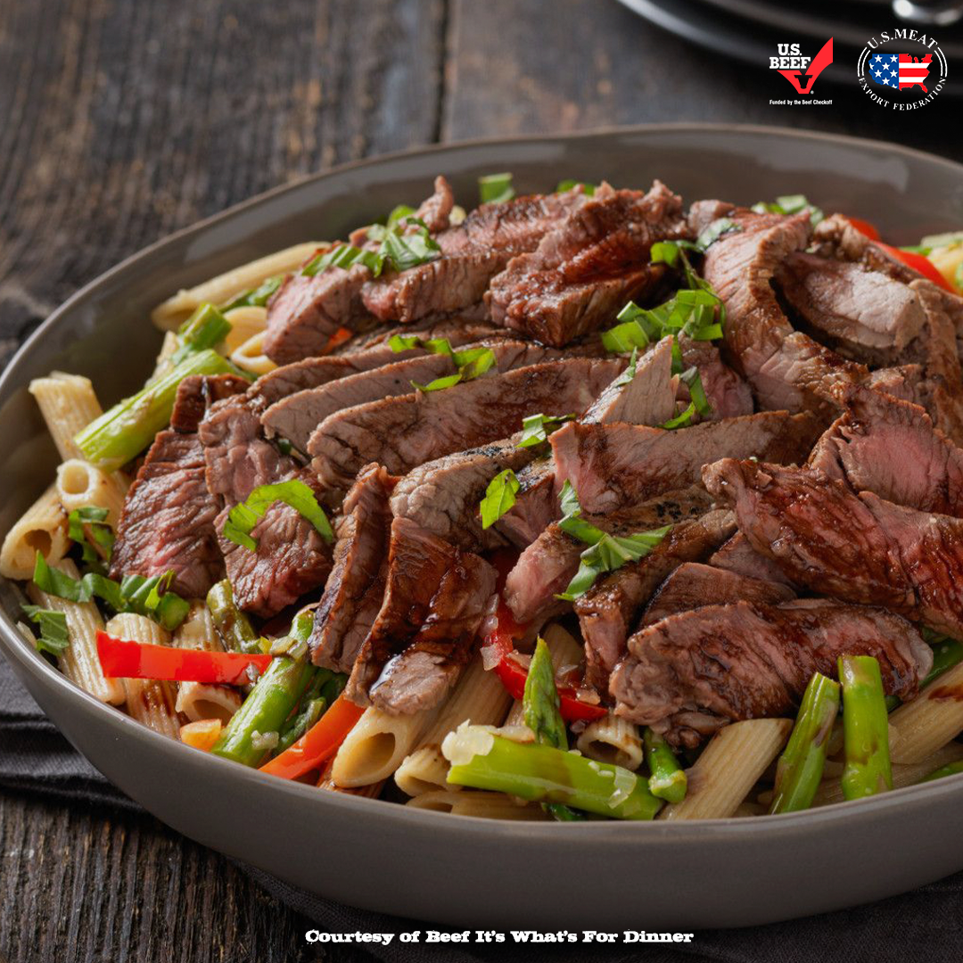 - Serve sliced steak over pasta mixture; drizzle with balsamic glaze. Garnish with basil and Enjoy!